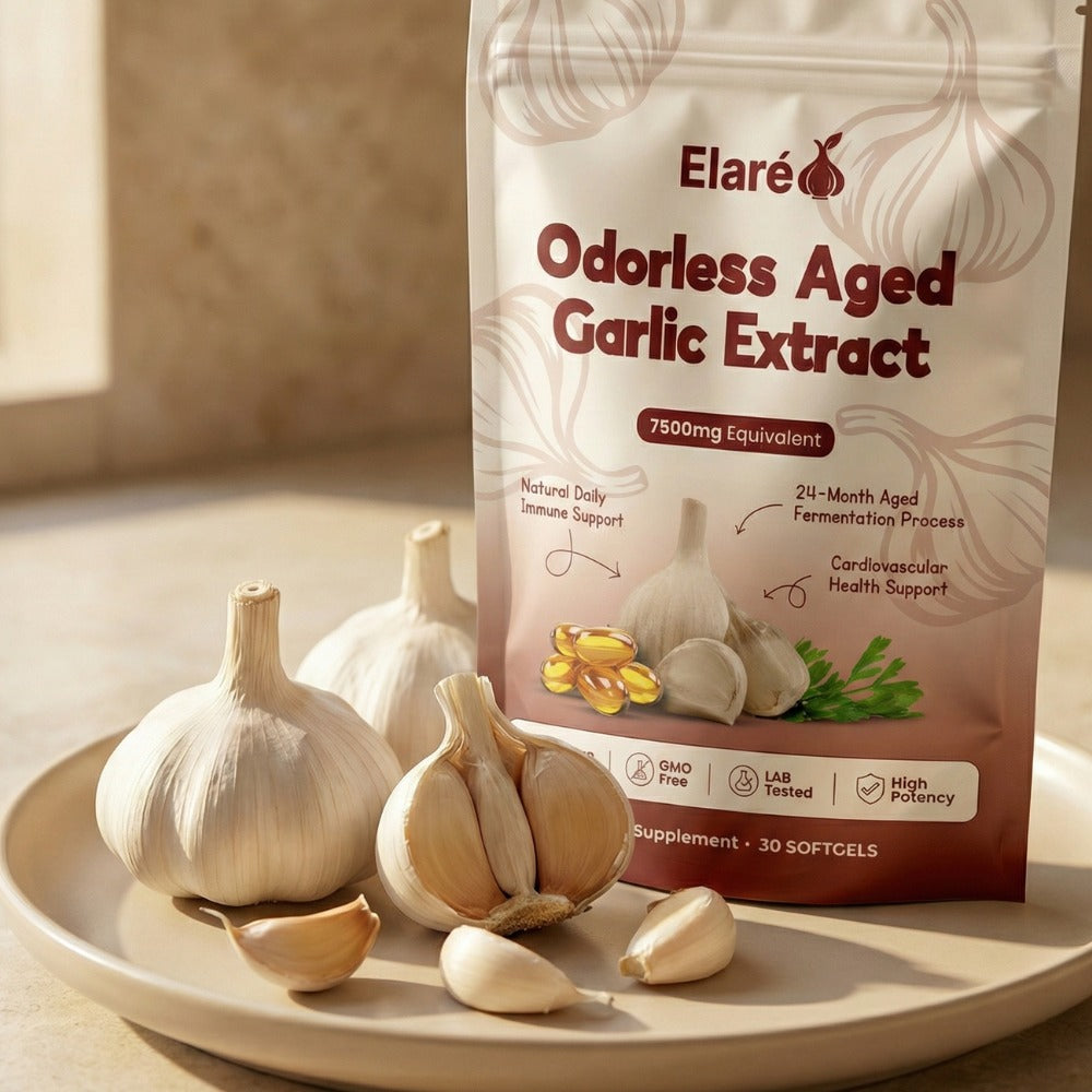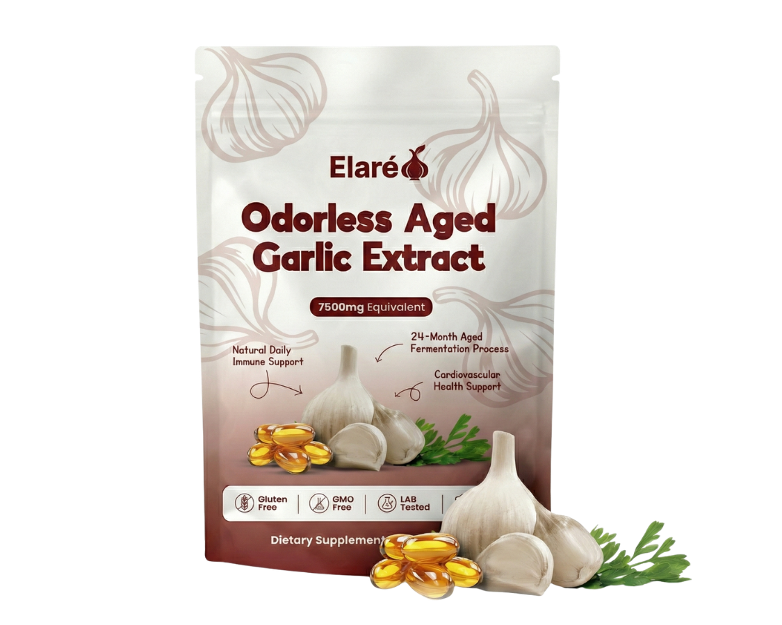 Elaré® uses odorless, slow-aged garlic extract designed for daily cardiovascular, immune, and antioxidant support. Backed by decades of scientific research.